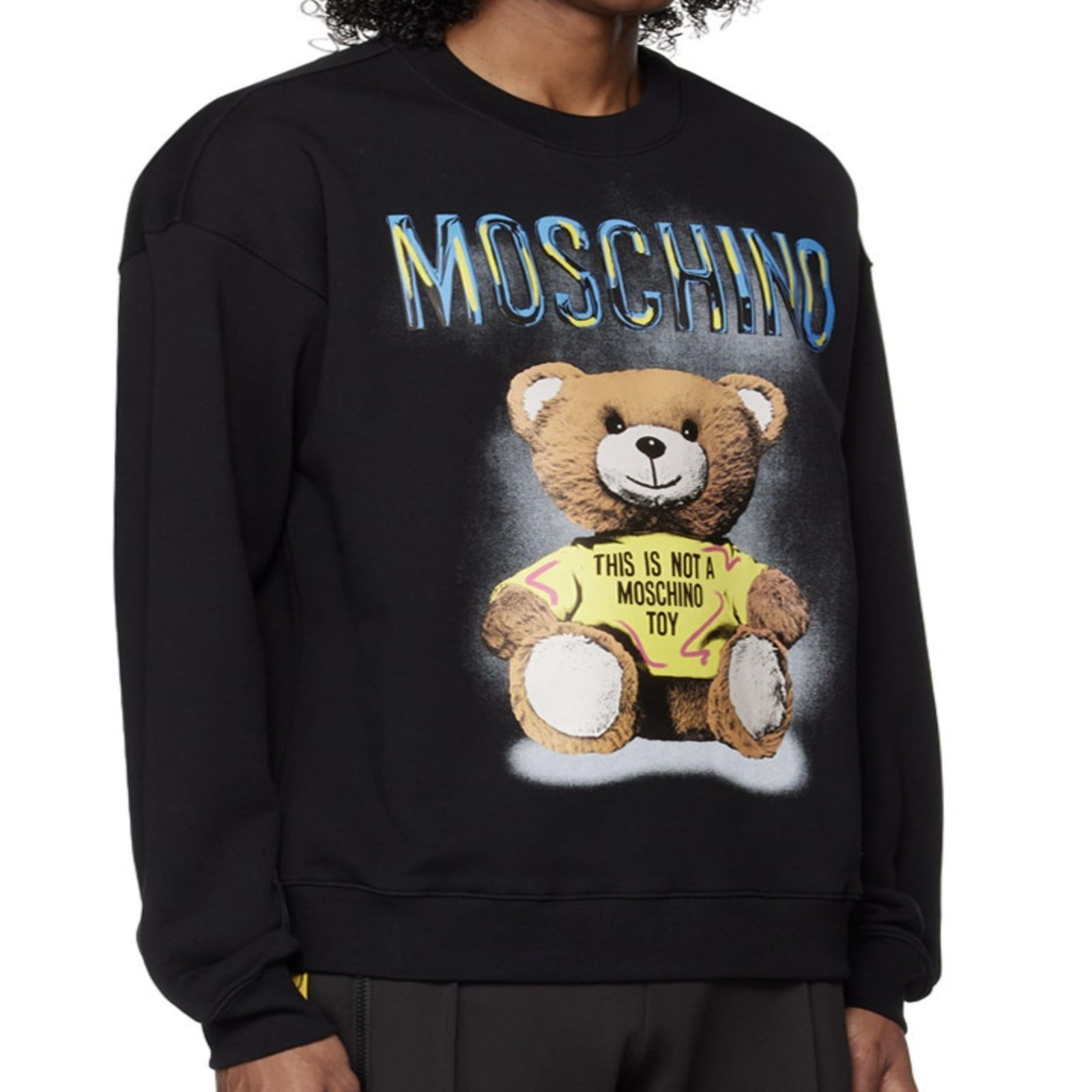 This is Moschino with organic cotton sweatshirt. This comes in rib knit crewneck, hem, and cuffs. It has a bold ‘MOSCHINO’ logo Teddy Bear graphic printed at front.