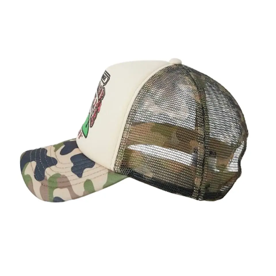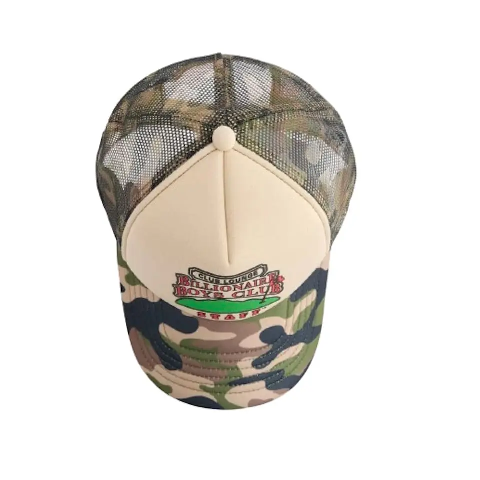 This is Billionaire Boys Club cap crafted from lightweight woven fabric with breathable mesh panels, this Billionaire Boys Club trucker cap delivers everyday comfort with streetwear attitude. Designed with a classic six-panel construction and a curved peak, it features a bold screen-printed graphic on the front and a camouflage finish for a distinctive look. The adjustable snapback closure ensures a secure, personalised fit.
