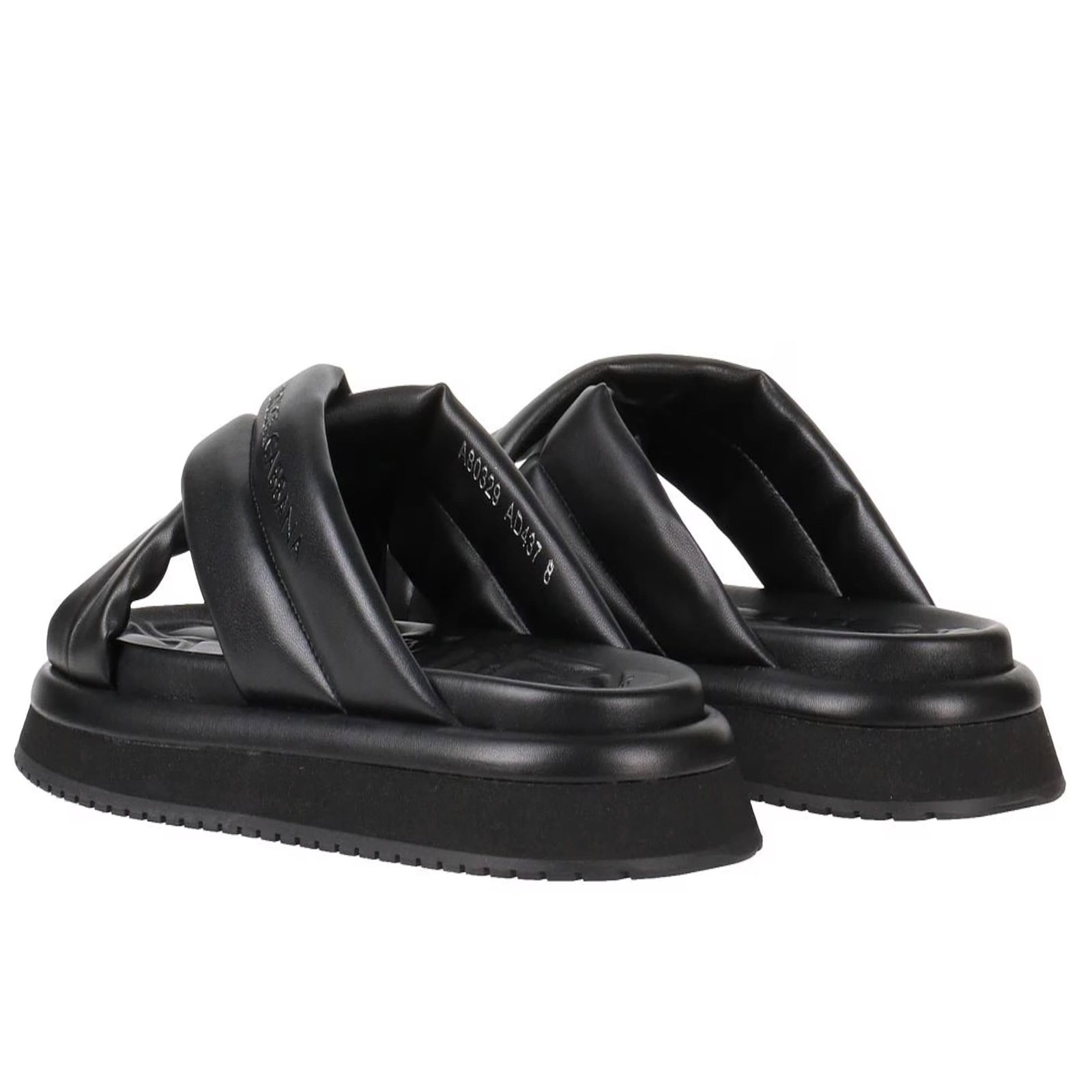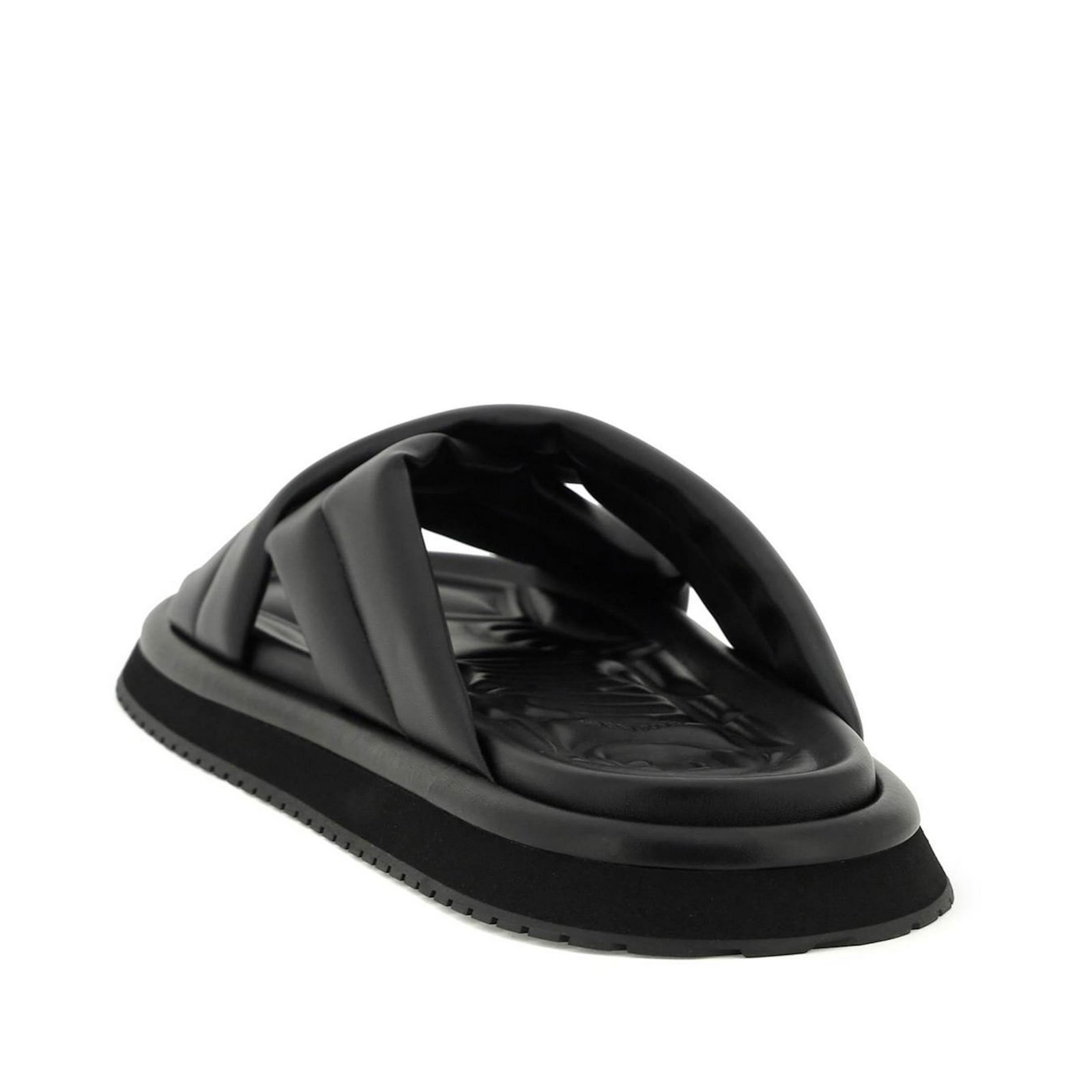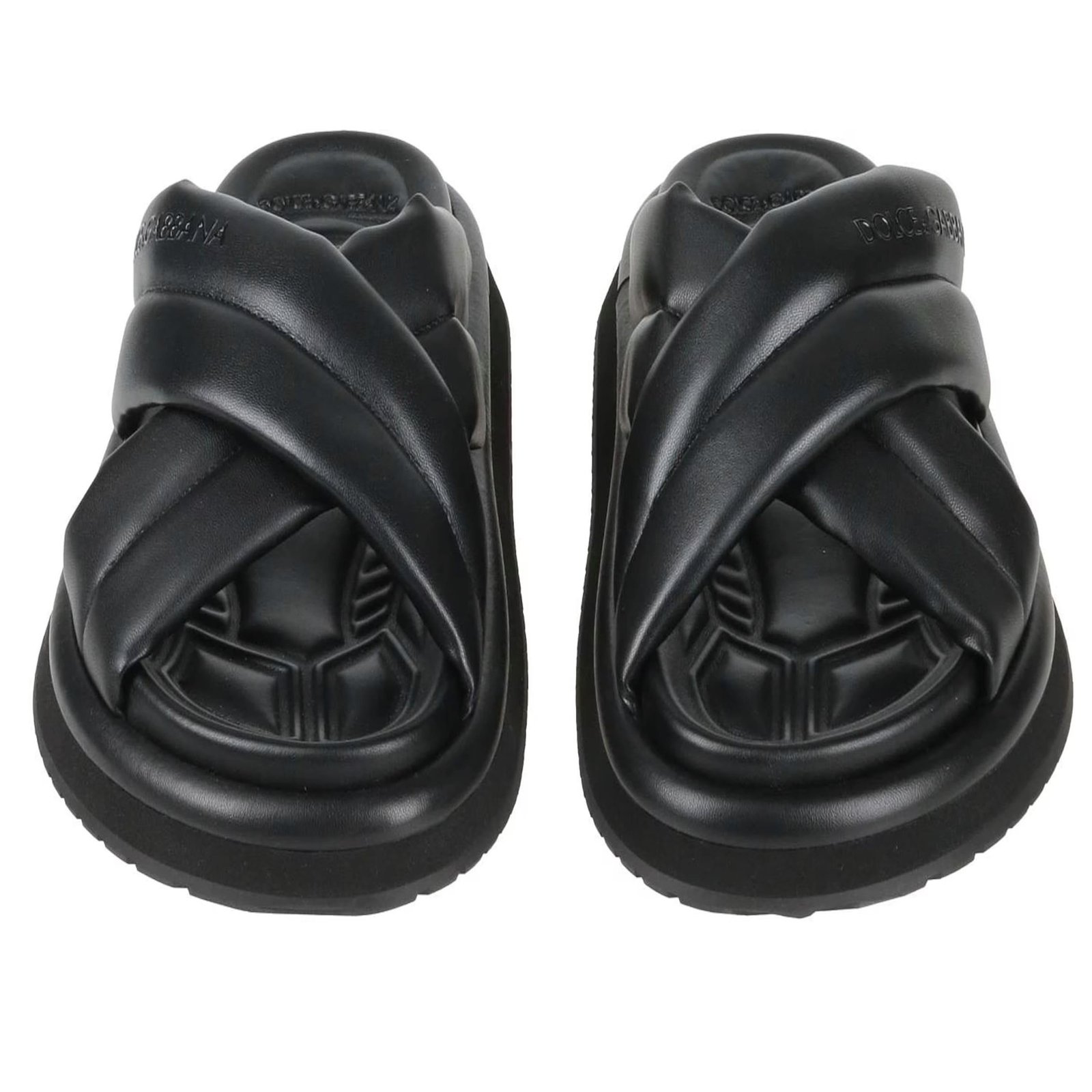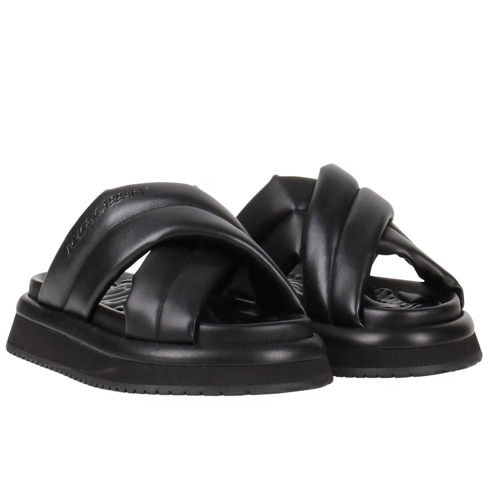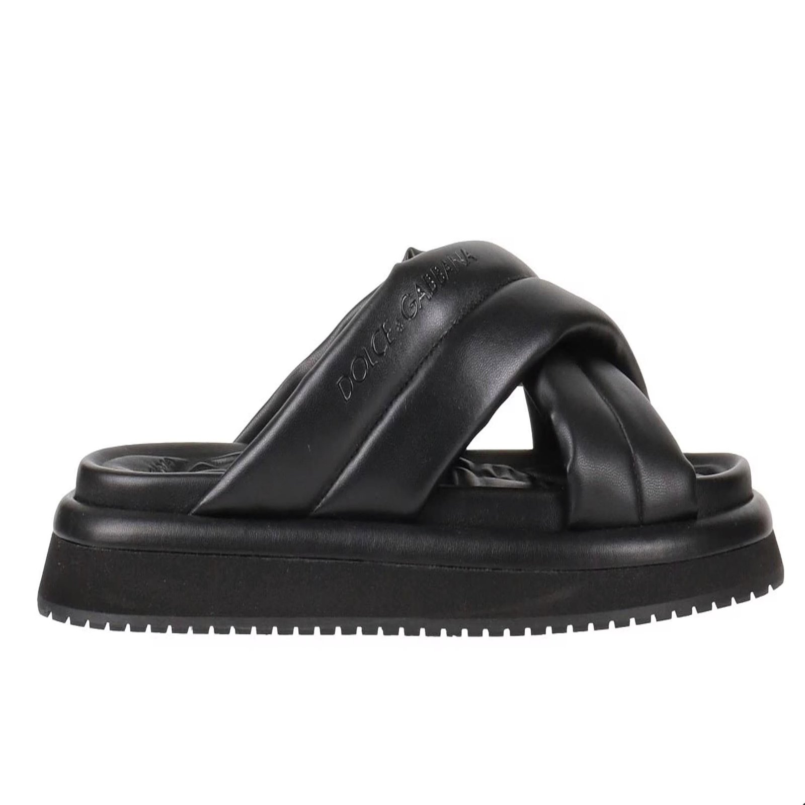 This is crossover-strap flat black sandals by Dolce & Gabbana made artificial leather with debossed logo to the side, crossover strap detail, slip-on style, open toe and flat sole