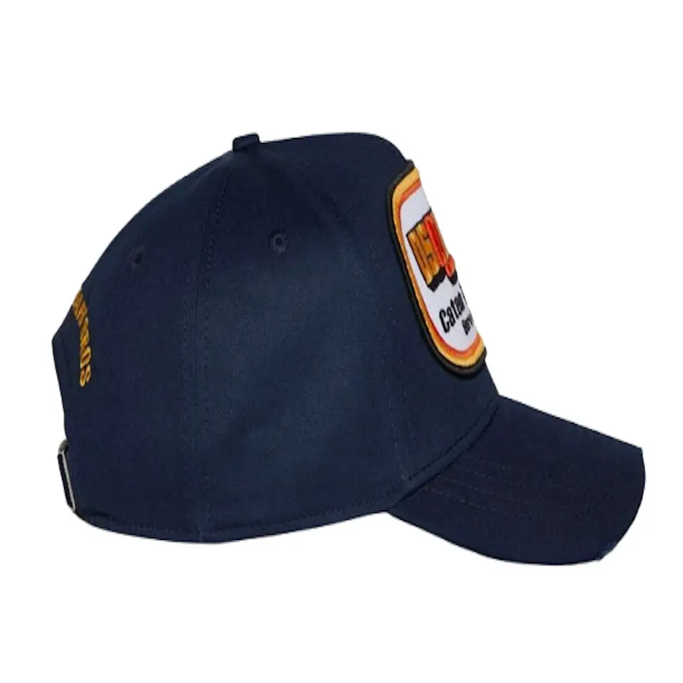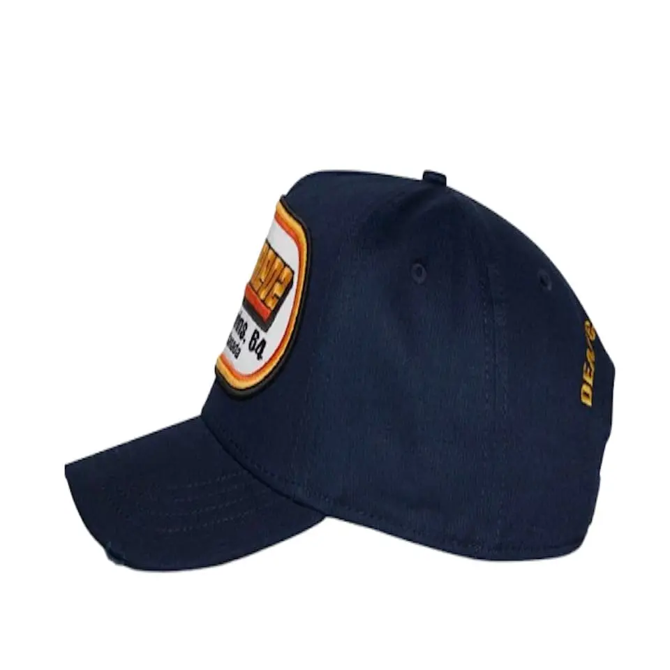 This is a Dsquared2 cap in blue colour designed in cotton gabardine, this baseball cap combines rugged detailing with iconic branding. Distressed accents give it a contemporary edge, while the front features an embroidered maxi ‘DSQUARED2 Caten Twins’ logo patch. Finished with yellow-coloured ‘ Dean & Dan Bros’ lettering at the back and an adjustable rear strap, it offers both comfort and statement appeal.