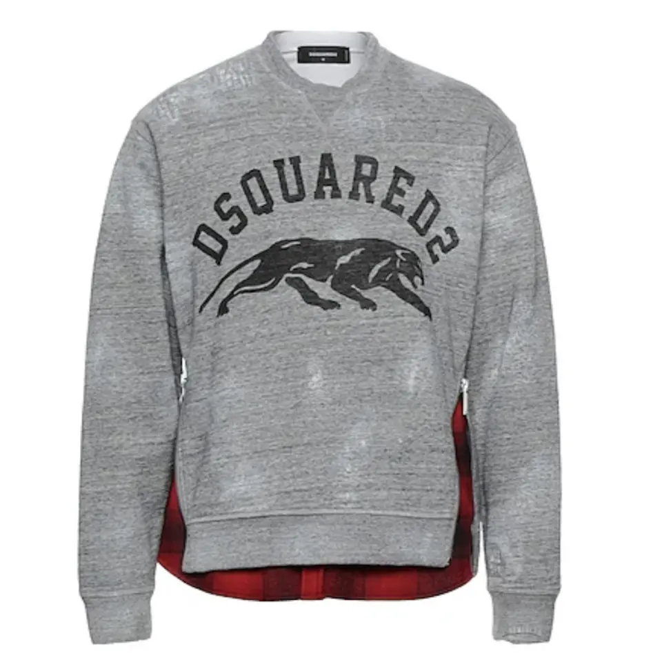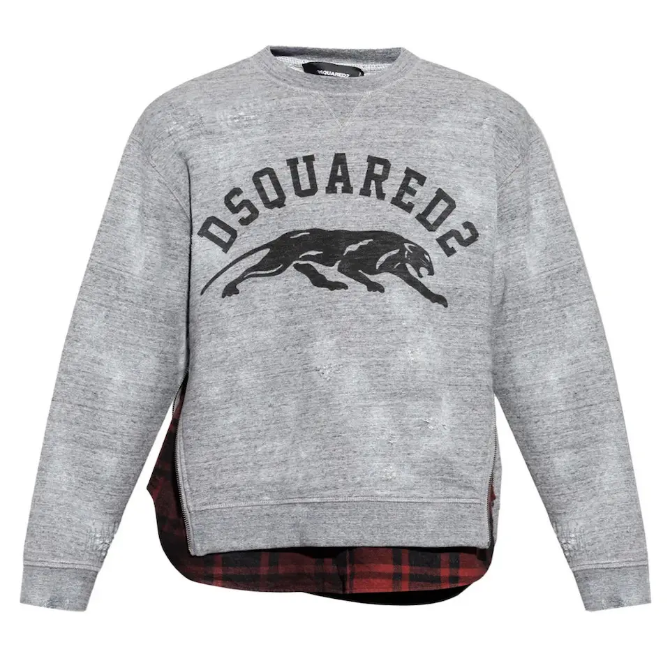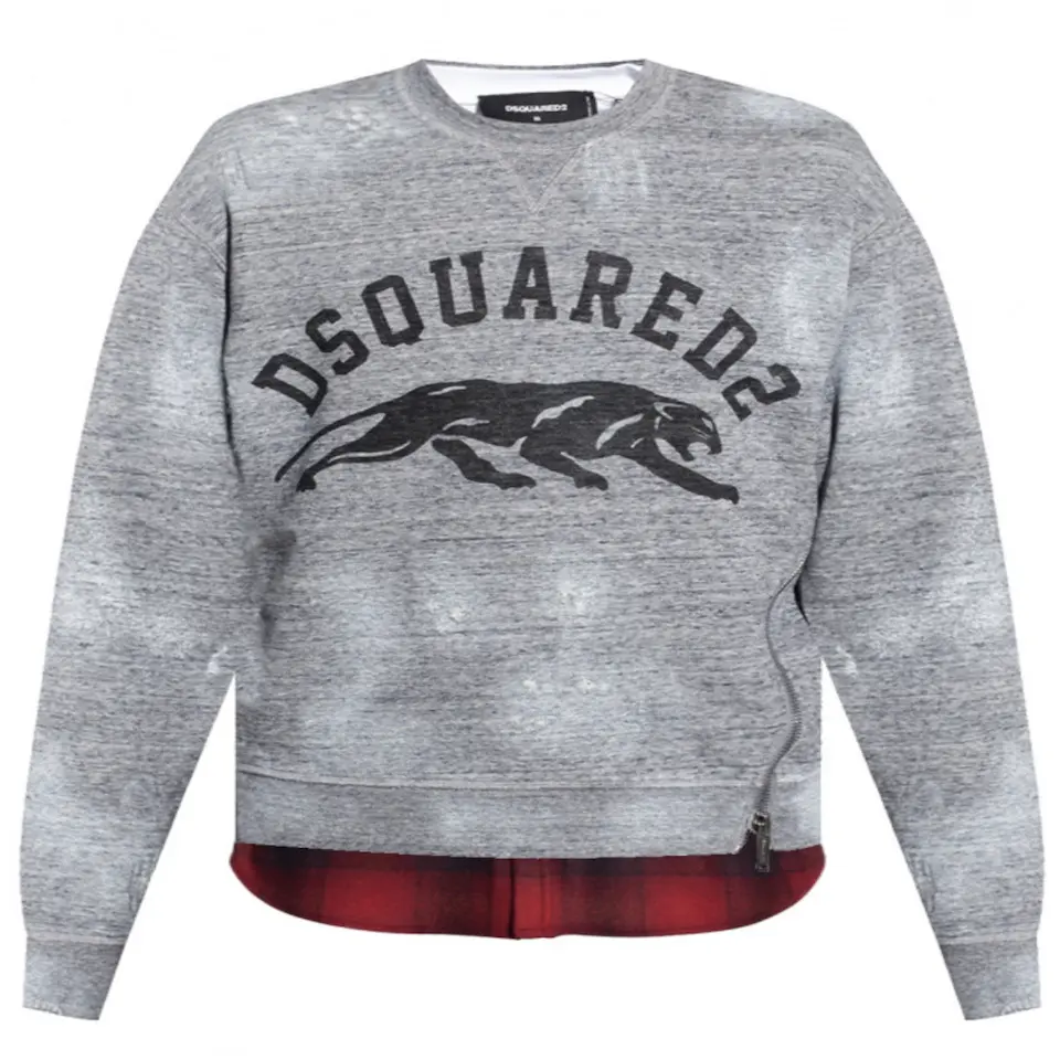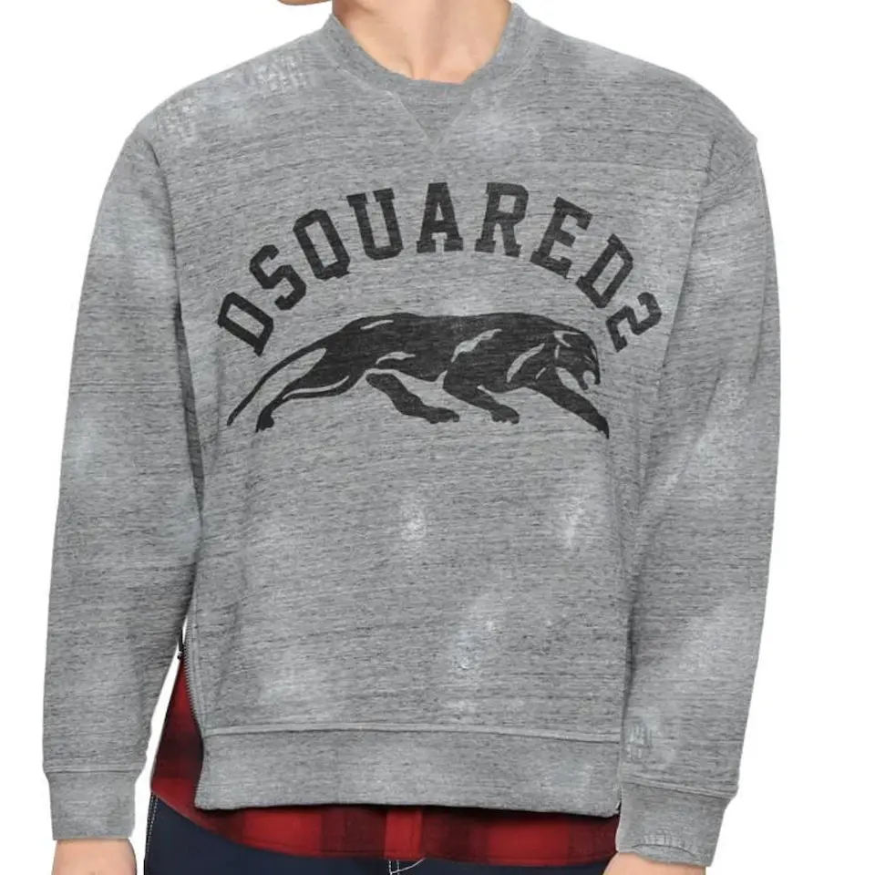 This is Dsquared2 long sleeve cotton fleece sweatshirt in heather grey colour. This unique top comes in layered construction, fading, distressing, and tonal embroidered detailing throughout. It has rib knit crewneck collar, cuffs, and hem.
