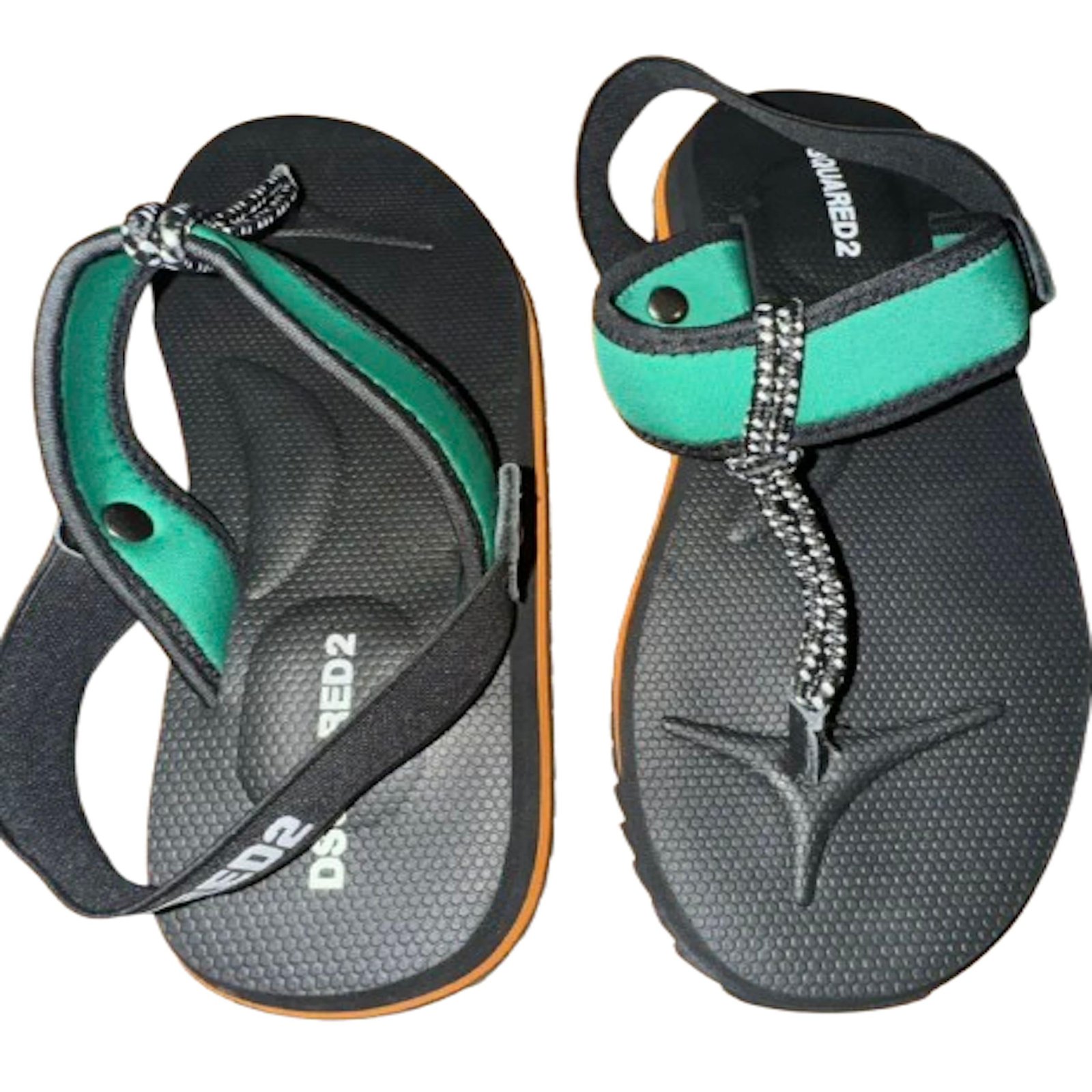 This is a DSQUARED2 Toe Post Strap Sandals. This lovely sandal has a distinctive wavy sole that adds a unique touch to its look. The upper of the sandal is made of both leather and plastic for added durability, while the buckle fastener over the straps ensures a secure fit. The "DSQUARED" logo is printed in bold white on the ankle strap, and is complemented by two fluorescent accents at each end of the strap. This sandal can be worn to casual or beach outing with short or trouser or jeans pant.