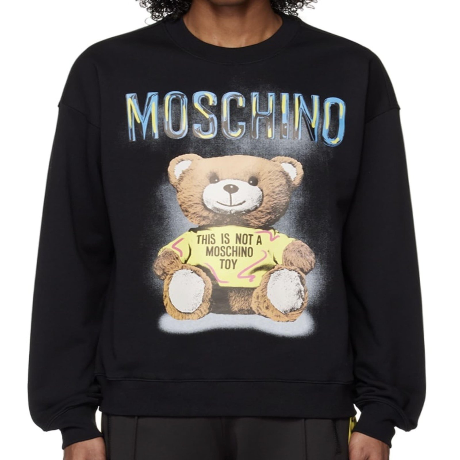 This is Moschino with organic cotton sweatshirt. This comes in rib knit crewneck, hem, and cuffs. It has a bold ‘MOSCHINO’ logo Teddy Bear graphic printed at front.