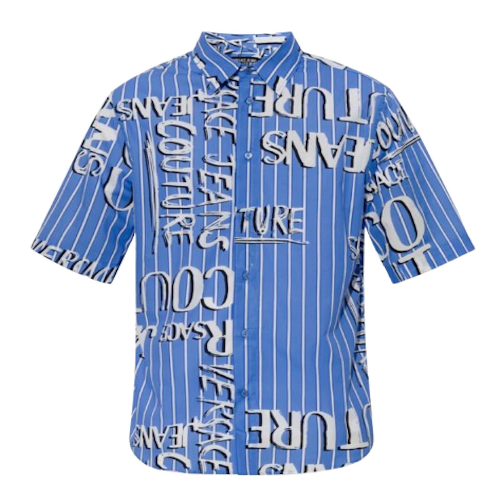 This is Versace Jeans Couture short sleeve shirt made of fine cotton and comes with fastens buttons and it is design in a black and white pinstripe pattern complemented with boldly printed ‘Versace Jeans Couture’ all round.