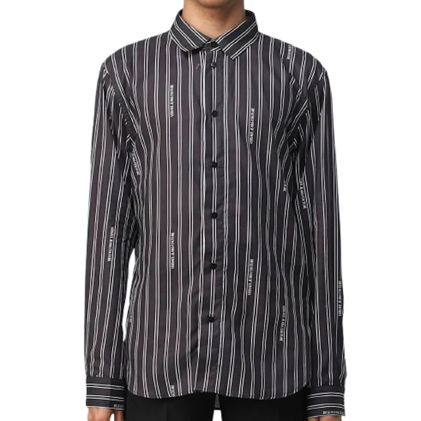 This is Versace Jeans Couture long sleeve shirt made of fine cotton and comes with fastens buttons and it is design in a dark grey and black pinstripe pattern complemented with tiny printed ‘Versace Jeans Couture’ all round.